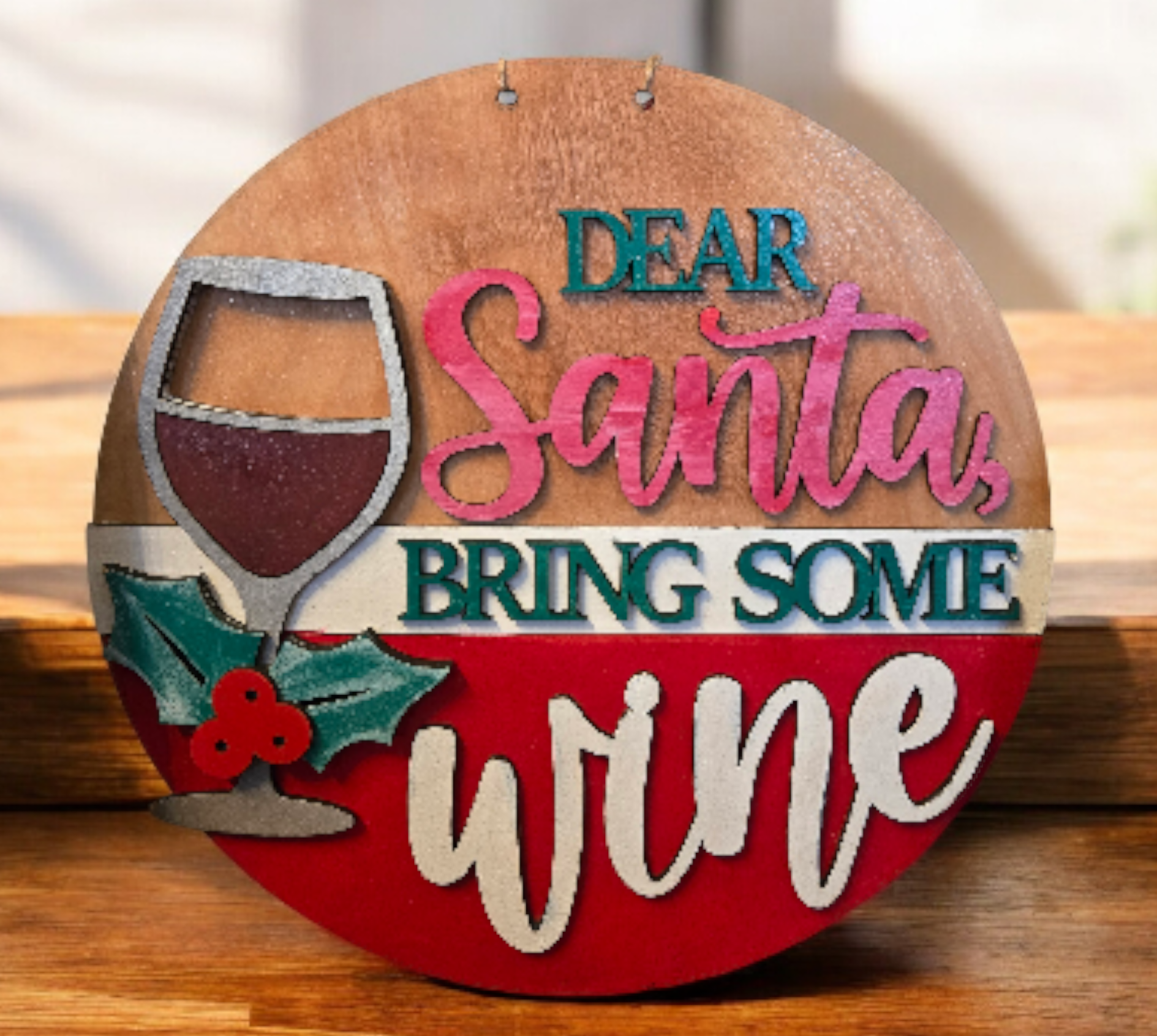 Add a little humor to your holiday hosting with this cheeky “Dear Santa Bring Some Wine” sign. This round, layered design combines warm rustic tones with festive pops of color—featuring bold raised lettering and a dimensional wine glass accent on the left, complete with holly leaves and red berries for a Christmas touch. The layout is playful and easy to read, with “Santa” in a fun script and “wine” oversized in bright white against a festive red base.