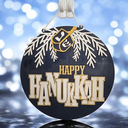 Honor the Festival of Lights with this elegant “Happy Hanukkah” round sign. A deep navy background sets the stage for layered white branches draping across the top and a golden dreidel hanging in the center. The phrase “Happy Hanukkah” is displayed in bold, layered lettering with white and gold accents, giving the piece a rich, celebratory feel.