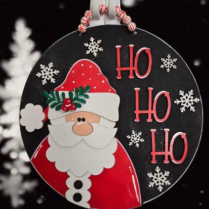 Bring classic Santa charm to your holiday decor with this bold “Ho Ho Ho” round sign. A jolly, layered Santa—with his red hat, fluffy beard, and holly detail—takes up one side of the black background, while the phrase “HO HO HO” stands tall in bright red letters on the other. Delicate white snowflakes scattered around the sign add a magical winter touch.