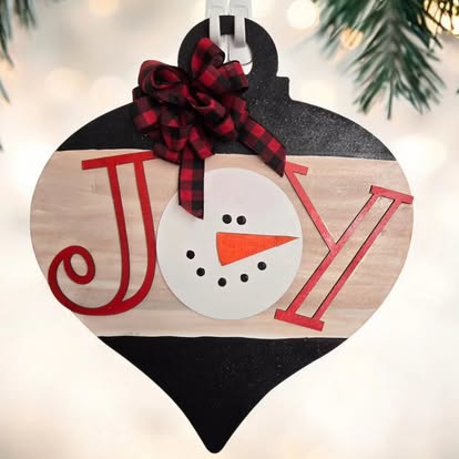Celebrate the season with this charming “JOY” ornament-shaped sign. Designed to look like a classic Christmas ornament, it features bold red letters spelling “JOY” with a sweet snowman face nestled in the center “O.” The sign is finished with black and natural wood stripes and topped with a festive buffalo plaid bow.
