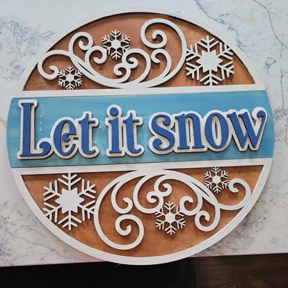 Celebrate the beauty of winter with this elegant “Let it snow” round wooden sign. A warm woodgrain background sets the stage for intricate white scrollwork and delicate snowflakes, all cut in layered 3D detail for a high-end, handcrafted look.