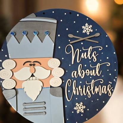 Celebrate your love for the season with this charming “Nuts about Christmas” nutcracker sign. A whimsical nutcracker in soft blues and grays stands against a deep navy background sprinkled with snow, while the elegant script text “Nuts about Christmas” fills the other side. Crossed nutcracker sticks and delicate snowflakes complete the playful, storybook look.