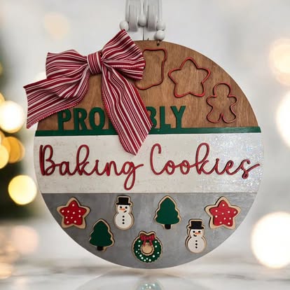 This “Probably Baking Cookies” round sign features gingerbread cutouts, festive mini cookies, and a striped bow. A cozy, handcrafted piece for holiday bakers and cookie lovers.