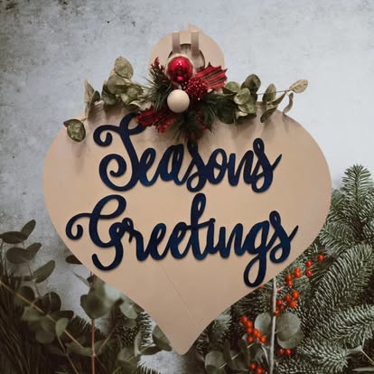 Welcome the holidays with timeless elegance using this “Season’s Greetings” ornament shaped sign. The phrase is written in flowing black script across a natural birch wood background, creating a clean, sophisticated look. The sign is beautifully accented with a festive greenery arrangement at the top, complete with red and white ornaments and a burlap bow.