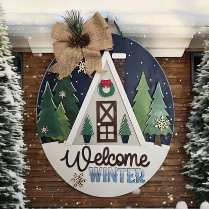 Turn your home into a cozy winter retreat with this enchanting “Welcome Winter” sign. A charming A‑frame cabin sits in the center, surrounded by layered evergreen trees, snowflakes, and a navy night sky. The lower half of the round sign features the phrase “Welcome WINTER” in mixed script and block lettering, with soft blue accents that echo snowy tones. A rustic burlap bow with greenery tops the sign for the perfect farmhouse finish.